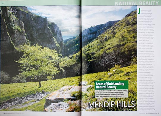 Geographical Magazine used my Cheddar Gorge image to illustrate their guide to The Mendip Hills, which is an area of outstanding natural beauty in Somerset, England <Back< Home
